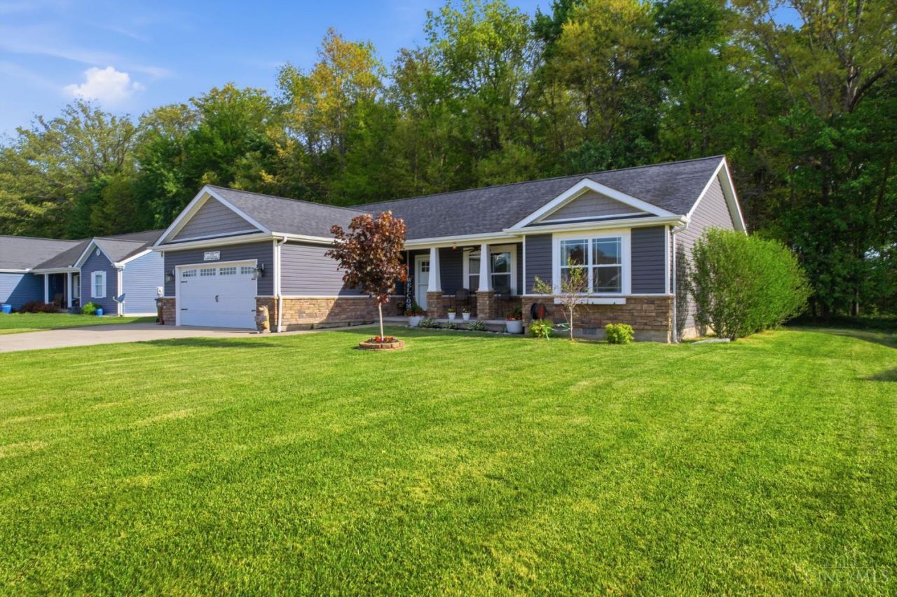 Welcome home to this beautifully designed 3-bedroom, 2-bath ranch offering over 1,700 sq ft of comfortable living space! Step inside to an open floor plan highlighted by soaring 9-ft cathedral ceilings and durable VLP flooring throughout the main living areas. The heart of the home is the spacious kitchen, featuring a custom granite island, stainless steel appliances, pantry, soft-close cabinetry, and convenient touch-activated faucetperfect for both everyday living and entertaining. Unwind in the inviting living room with a cozy electric fireplace or retreat to the bonus room ideal for a home office, playroom, or flex space to fit your needs. Out back, relax on the covered porch overlooking a peaceful, wooded lot your own private escape. Additional highlights include an energy-efficient water heater (Sept 2025) and thoughtful finishes throughout. This home blends modern convenience with comfortable living don't miss your chance to make it yours!